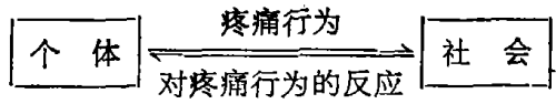 公开性疼痛意指任何时期患者与他人之间的一种社会关系。这种关系将决定所流露出的疼痛是否为第一次,它是怎样表达的,以及疼痛的反应如何。莱维斯(Lewis)曾着重提到在这种情况下,病人的期望值是十分高的,特别是对疼痛的产生反应,揭示疼痛的社会价值和效应。“保健的好坏、同情性及其他人对疼痛关切程度都会影响人们表达其疾病的方法。”如果疼痛者处在人们对其疼痛关注的环境中他将会受到最大的关心和同情无论是通过充分的情感流露还是通过行为的温柔改变。正如佐拉所指出:“这说明他们受注意的程度是社会对某些病症的反应”,因此,疼痛行为,对疼痛作出反应,它们之间存在的互相影响,在个人和社会之间存在着一个动态平衡(如图所示)。