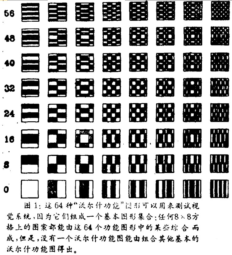 所以,里奇蒙和奥普蒂根决定重新开始检测在脉冲序列中见到的模式。他们决定用工程师的办法研究这个问题,设计了一种全新的、无偏的测试系统。首先,他们抛弃了别人认为可能是感受野中重要特征的正方形和带状图形,而代之以一组叫做沃尔什功能图的抽象的网格图形(见图1)。