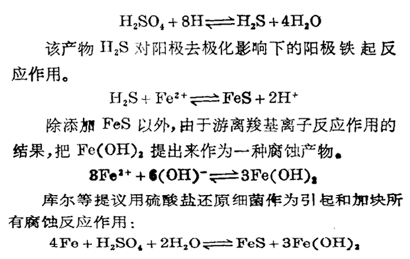 在描述硫酸盐还原细菌厌氧腐蚀铁和钢所起的作用中,通常被认为是由于细菌对阴极氢的摄取所造成理论上所提到的阴极氢的形成有两个因素。根据速率公式,普遍认为是水的离子化作用和水的直接还原作用产生氢,低电流是由不产生氢的腐蚀细胞所造成,氢离子活度是中性偏低,而且特别是在碱性pH值中更是如此。