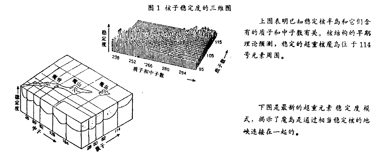 三维图(图一左)也清楚显示了随着质子和中子数的增加,原子核的稳定性是怎么变化的?三维图的对角线上有一个稳定的“多山半岛”,在图的下半部,稳定核有大致相同数目的质子和中子,越向前则中子越多。山峰处是所谓魔数——即生成最稳定封闭壳层的质子和中子数。半岛周围是一个不稳定的海,在最远处,原子序数为114处,有一个稳定岛,在那里有114个质子和184个中子的原子核估计是一个特别稳定的球形体,因为质子和中子壳层完全被填满。这些元素会比许多原子序数低的元素更稳定。