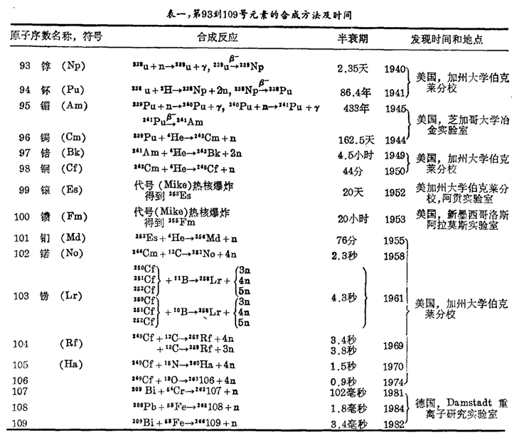 怎样合成这些新元素呢?“超铀元素”第93.95.99和100号元素是通过中子来轰击靶子元素,接着中子被吸收来制造的(见表一)。这就是Mc Millan,E. 和Abelson. P. 用U-238制造了Np-239,及本文作者之一(Seaborg,G. )和其同事用Pu-239制造了镅。因为中子是电中性的,所以它容易进入到原子核中,像铀和钚原子,中子被吸收后,通过强核力作用,和其他的质子和中子相结合,这个过程不会产生出新元素,因为被俘获的中子不影响核中的质子数,只能制造出不同于靶子元素的新同位素。