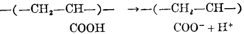 像丙烯酸电解质高分子的离解度,会随其水溶液pH值的增加而变大,这样,高分子链在离解正离子后即带负电荷: