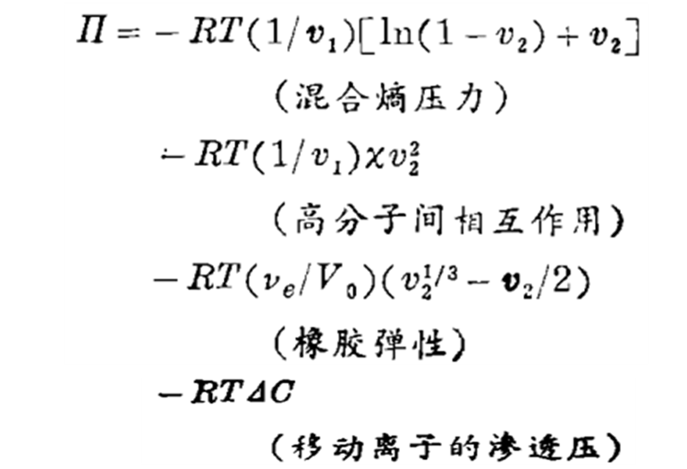 链段之间的距离改变后,或者说当链段之间的距离宽窄不同时,对应的熵是不同的,同时混合熵压力也存在。这里,将以上诱发高分子交联结构变化的因素用一表达式表示出来,即如P. J. 弗洛里(P. J. Flory)在其书中所描述的,为