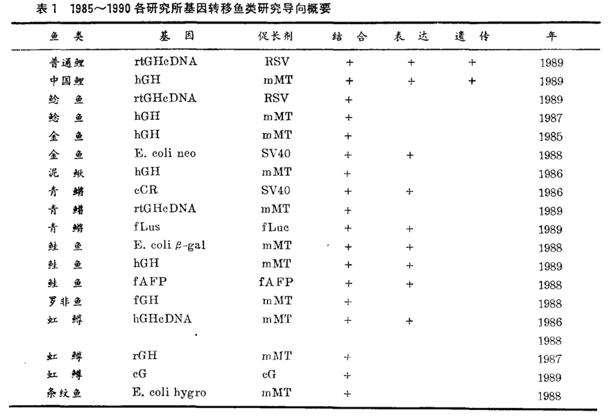 1985年朱(Zhu)等报道成功地将人类GH基因与老鼠金属硫堇助长基因融合并注入金鱼体内。金鱼F1(子一代)后代基因转移鱼类的生长为非转移种类的两倍而GH注射入虹鳟和蛙鱼也产生了一致的促进生长的生物综合效果。虽然Zhu等没提出强硬的证无目标融入鱼染色体组;(C)逐渐遗传到繁殖的下代(F1):(d)异基因已在繁殖的P1和F1中表达;(e)表达了异GH基因的增加且促使P1和F1基因转移鱼类生长率的提高。