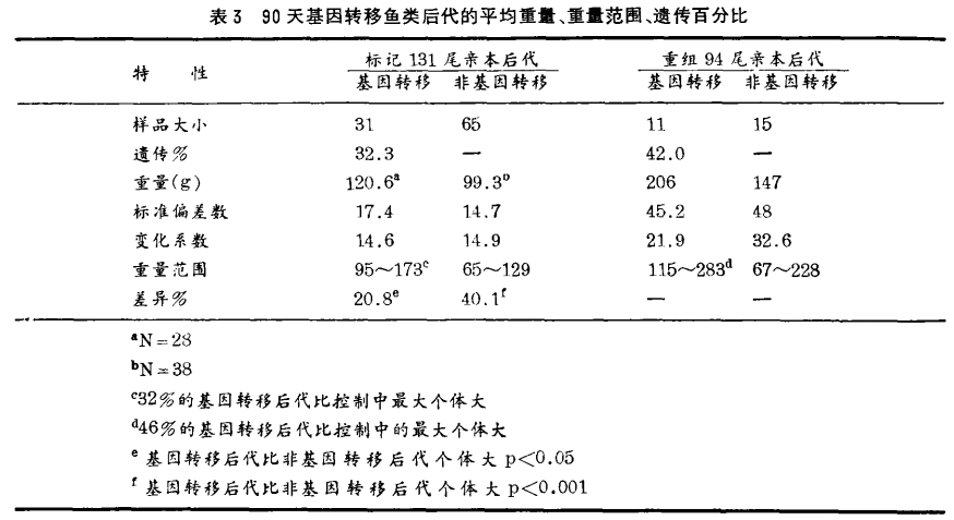 张(Zhang)等研究106分子线性重组质粒包含长期终止重复(LTR)鸟类劳斯肉瘤病毒(RSV)序列和将虹鳟的GH1cDNA微量注入普通鲤1—4期胚胎细胞中。DNA染色体组样品从胚胎发育来的个体胸鳍提取并用嫁接点和南方异种突点分析,利用RSVLTR和虹鳟GH1cDNA作为探子。注入微量剂的胚胎其存活、孵化率为35%,约10%的存活个体中发现已稳定与pRSVLTR-rtGH1cDNA序列融合。而虹鳟GH多肽表达也在许多遗传转移个体中检验到。虽然不少P1基因转移鱼大小有变异,平均比同科控制的鱼大20%。更进一步随机选择F1的后代(由P1基因转移雌鱼和非基因转移雄鱼杂交的)遗传和异基因片断。这些基因转移后代不仅比非基因转移的同类鱼生长快而且也比其父母生长快(表3)。基因转移实验包括人的GH基因结构成分得出的相似结果。中国鲫、鲤F1后代实质上比P1母父杂交的后代大,与利用的镜鲤相差无已。虽然转移、表达和异种GH基因遗传研究大有进展,一些基因转移鱼的生长结果明显快于同科非遗传鱼类,快速生长的基因转移鱼类的后代商品鱼仍处于发展阶段。今后研究发展的总目标是:(1)改进基因转移效果;(2)鉴定适合的助长剂以推动GH异源基因表达型:(3)确立生理学、营养学和环境遗传因素而充分显示转移个体的特性;(4)评估安全和环境效果。