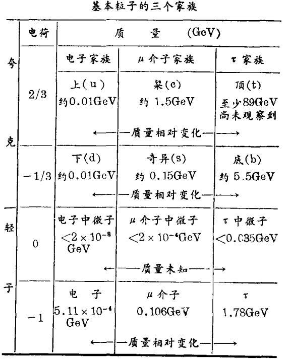 在弱电理论的粒子分类中有两个实质性的漏洞:第一,尽管理论上要求费米子成对地出现,但并没有规定多少对费米子组成一个家族。没有理由说明何以各个家族不能有别的尚未观察到的粒子类型(除轻子和夸克外)。这种可能性引起大批我的同行们的兴趣。然而至今尚未观察到新的粒子。第二,这个理论对于本文的中心问题——物质的家族数未置一词。也许由粒子建立的更高的家族太重,以致现存的加速器难以把它产生出来?
