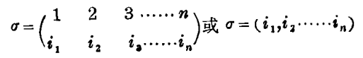 表示置换σ。由于σ是一一对应且及其本体的,因而序列i1,i2……in是数1,2……,n的一个排列。n阶置换的排列数为n!。例如了阶置换是:(123),(132),(213)(231),(312),(321)。即3!=1 · 2 · 3=6。