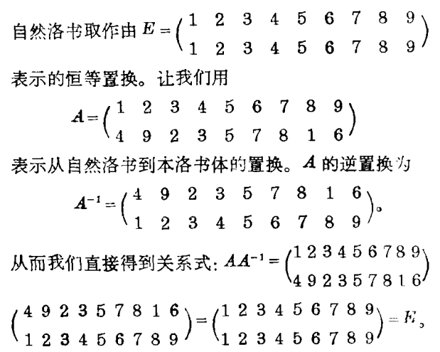 (c)S9的置换的乘法:置换的乘法是由一给定的置换形成新置换的程序,如我们将某置换A施加于S9的任一元素x,然后再将置换B施加于新元素xA得(xA)B。如果将x直接置换成(xA)B的置换称为A与B的乘积AB,根据定义我们有x(AB)=(xA)B。置换的乘法与数的乘法有某些类似,但必须注意,在数的乘法中交换律与结合律都是真的,而置换乘法则服从于结合律而不服从交换律,因为置换乘法与因子顺序有关,x(AB)≠ x(BA)。
