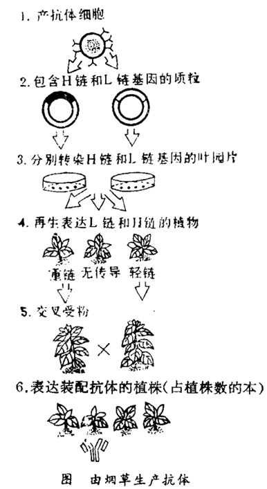最近已报导在烟草中成功地表达了抗体。一种具有催化作用的抗体,已于选择的试验烟草细胞中,在不损伤其功能的情况下装配和处理免疫球蛋白链。编码重链和轻链的cDNA首先被转入农杆菌种已被证明在转化多种类型植物细胞非常有用的细菌,农杆菌质粒能可靠地将DNA转移到植物细胞中,随后与植物基因组整合,转化的植物细胞可再生为成熟植株。用于植物产生抗体的策略是转染叶圆片。再生能表达重链和轻链的植物(见图)。