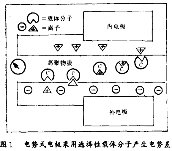 图1表示高聚物膜离子选择电极。内、外电极分别在高聚物膜的两面。外电极同待测溶液接触。借助于对阳离子有高度选择性的载体分子,待测物中阳离子鲜选择性地迁移,通过高聚物膜。阴离子由于没有识别载体分子,而不能通过高聚物膜。载体分子将待测离子释放到传感器内的溶液一边。结果外电极和内参考电极之间就建立了电势差。这个电势差是样品中离子浓度的函数。这样通过选择性结合的高聚物膜的中介作用,将选择性传给了非选择性电极。