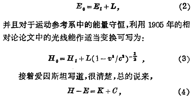 我们可以理解普朗克反对的理由。其中φ是观察者相对于物体的速度v和观察者与辐射源之间连线的夹角。属于电磁能的内能可以由许多E和φ的不同值的光子(爱因斯坦和普朗克在那时都没有使用这个名词)的完全混合构成。通过展开(18)式中根号下的部分可以看出,这样构成的内能仅在只保留一级近似项v/c时才是恒量。尔后(18)式可以简化为爱因斯坦的方程式,即(4)式,并且他的展开也只对保留到一级近似项v/c才是精确的。这个结果解释了普朗克反对的理由,但是在今天来说它显得有点杂乱,因为我们知道E=mc2是精确的,并且在这个结果和(4)式之间存在着一个直接可逆的逻辑途径。