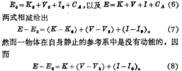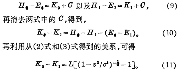 如果把括号中的两项写成一个附加常数C,然后改用适当的符号表示E和E0,那么(8)式就可写成和爱因斯坦引入的(4)式相同的形式。在经典力学中,两个参考系中的势能多一个常数项时,我们认为它是不变的。即使存在一个从经典角度看与速度有关的磁场,对于这个思想问题,物体速度的恒定将保证V-V0是常数。根据经典力学,内能项I-I0也将被认为是常数。如果内能是微粒运动的结果(例如热内能),则可以分为相对于质心的动能(包含在内能项I中)加上质心的动能(含在K项中)。只有K中的内能部分随观察者的速度而变。因此I-I0将是常数。不能立刻清楚的一点是I-I0对相对论力学而言也是常数,后面将考察这种情形。爱因斯坦的有争议的方程至少是动能的经典描述这一点是清楚的。