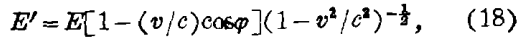 相对性原理告诉我们,对于不变的相对速度v,每个观察者所做的观察不依赖于其如何达到相对速度v的方法。因而(20)式不仅对第一种情况适用,也对第二种情况完全适用,把(20)式代入(19)式得到: