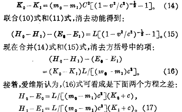 爱维斯注意到,这两个方程和爱因斯坦所采用的(9)式是不相同的。他声称,爱因斯坦在引进(9)式时所说的“很清楚”就引入了联系(9)式和(17)式的乘积因子L=(m0-m1)c2 ,“…这正是推导过程应该产生的那个特别的关系式。”