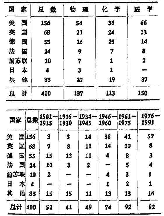 表中数字是按国家分类的本世纪初以来科学(物理、化学和医学)诺贝尔奖新得主的数目。首先可以看到在本世纪中美国科学的持续进步。德国在二次大战前是一得诺贝尔奖多的国家,但最近15年来却戏剧性地大大下降了。相反,英国却显出强大实力,成为唯一在诺贝尔奖上可与具有绝对优势的美国相抗衡的欧洲国家。而日本几乎不存在。至于法国位于德国那样与英国相抗衡的半路上。同时可看到其他国家得奖数几乎是稳定不变的,前苏联尽管在科学上作了众所周知的努力,但成果不大。