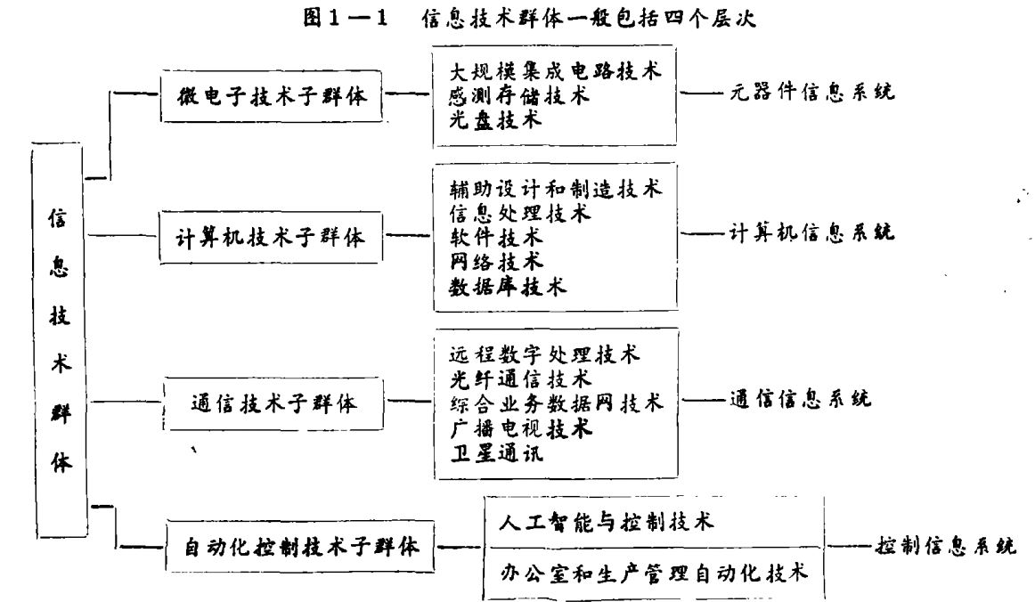 信息技术产业化的产生与发展,不像以往的技术革命那样,是由比较单一的技术发展起来的,而是采用群体的形式在短短的十几年内涌现出来,是信息技术与传统技术,以及信息技术内相互作用的结果,并导致了新的信息技术领域的产生和发展,信息技术群的层次表明,这种产业化的技术群,把类似或作用差不多的技术集中在一起,形成实际上每一个中间技术层次本身又是一个技术子群体。