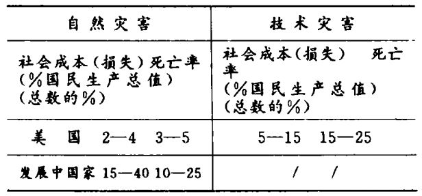 1975年,美国在空气、水、土地污染方面的费用为40.6亿美元,占国民生产总值的2.1%,同年,用于汽车事故费用估计为7亿美元,占国民生产总值的1.9%。在我们的估算中,与技术灾害相关联的死亡率为:男性占20~30%,女性占10~20%。1979年,在私人和公共事业灾害管理方面的总消费以及加上直接的损失价值,估计为179~283亿美元。相当于国民生产总值的7.8—12.4%。