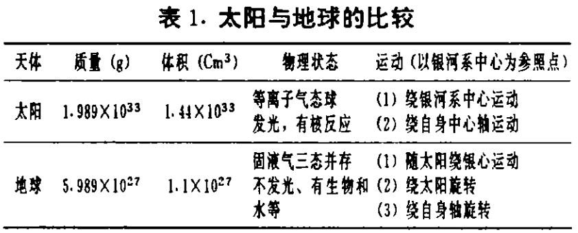 太阳与地球是不同类型、不同层次的天体,在质量、体积和物理状态等各方面都有巨大的差别,如下表1。