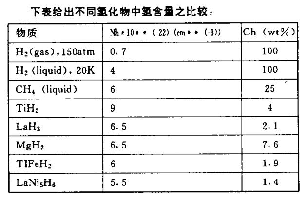 由表可见,贮氢合金的贮氢密度比液体氢还大。贮氢合金在储氢、氢气吸收与分离、氢气的超纯提纯、氢气压缩、热存储、热泵和氢化物电极制造等方面有极其广泛的用途,是一类新的功能材料,是当前研究开发的一个热点。贮氢合金的研究已被纳入863计划。在Ni-MH蓄电池中,贮氢合金用作负极,靠氢电子的吸附和脱附反应进行充电和放电。其反应方程式为: