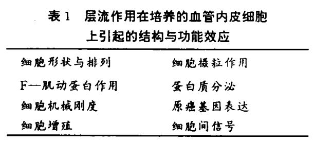 生物人工血管的开发,作为一个例子,涉及到本文引言中所给定义中的所强调的两个方面;在达到生物替代物(在这种情况下,人工血管至少部分由活细胞构成)的目标之前,人们必须对血管生物学的结构/功能关系的内在本质有深入了解。这就涉及到对血管ECs和SMCs的结构与功能、它们之间的相互作用、胞外基质所起的作用(包括机械应力在内的环境对ECs和SMCs的影响)。如前所述,在稳定层流的作用下,血管ECs形状变长,其主轴则沿着流动方向排列,并且作为对流动的部分适应,EC发生着许多在结构与功能上的变化,表1对此作了概括。此外,在脉动流的作用下,虽然定性的变化是相似的,但定量时就有所不同,因而血管ECs可以区分出不同类型的流动环境。