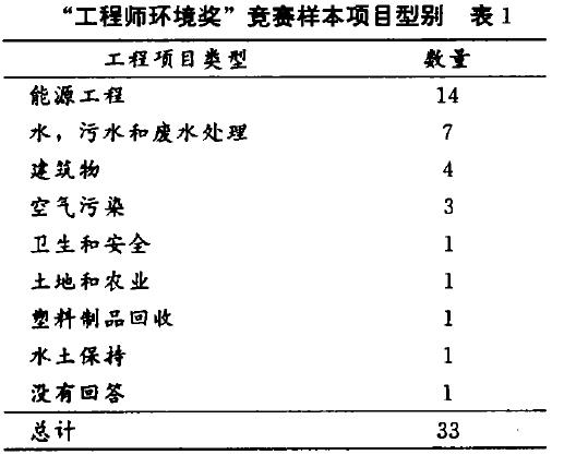 表1-2显示了“工程师环境奖”竞赛的基本情况,其中,表1显示的是样本自身的情况,即说明样本的项目型别。
