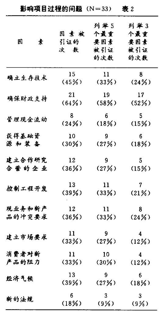 表2显示了各因素作为问题被回答者引证的次数,并且带有这些次数所占样本总体的百分比(%),它还表示了对项目进展最重要的因素(第三栏列举5个,第四栏列举3个)的回答次数和百分比。它表明,“确保财政支持”是该样本中工程师们引证得最多的因索(64%),也是认定5个或3个最重要因素中提得最多的(分别为58%、52%)。“形成技术的生存能力”问题,在被引证的次数(占45%)和在5个重要因素中发生的次数(占33%)中,均居第二位。其余多次被引证的因素,包括“控制或管理工程项目开发”和应付主导的“经济气候”两项。