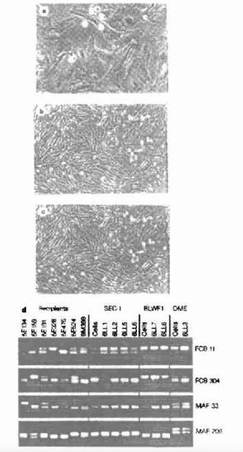 a.胚胎细胞(SEC1; b.胎羔成纤维细胞(BLWF1; c.乳腺细胞(OME;d.用四种多态性绵羊标记对受体母羊、核供体细胞和羔羊进行的微卫星DNA分析。从上至下,母羊与羔羊的排列次序一致,细胞类型分别是胚胎细胞(SEC1),胎羔细胞(BLWF1),乳腺细胞(OME),羔羊与供体细胞有相同的基因型,而与受体母羊则不同。