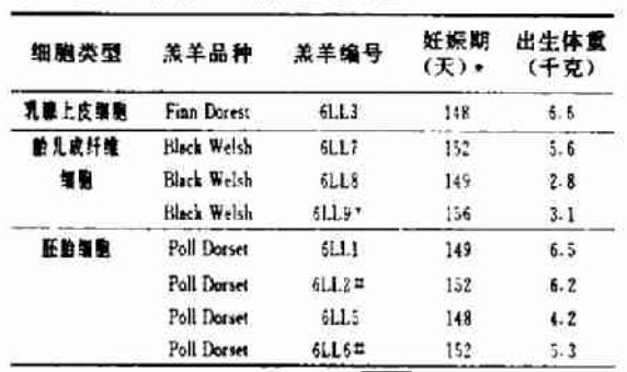 三类新细胞分别取自(1)9天的胚胎 :(2)26天的胎羔 :(3)怀孕最后3个月的6岁母羊的乳腺。胚细胞的形态(图1)与我们以前研究用的小鼠胚胎干细胞和胚胎细胞都不相同。核移植按我们建立的方法之一进行,重建的胚胎被植入受体母羊。在动情期50~60天后。超声扫描检测到21个单胎(表1)。其后每14天扫描一次,观察到的胎羔减少了, 这可能是由于误诊或流产。总计有62%的胎羔丢失,明显高于自然交配后大约6%的丢失率。已有报道胚胎操作或未重建胚胎的培养均增加出生前胎儿丢失,怀孕110天左右,四个胎羔死亡,它们都来自胚胎细胞,杀死母羊后进行尸检。发现两个胎羔肝脏发育不正常,但未检测到其他异常,也未发现受到感染。