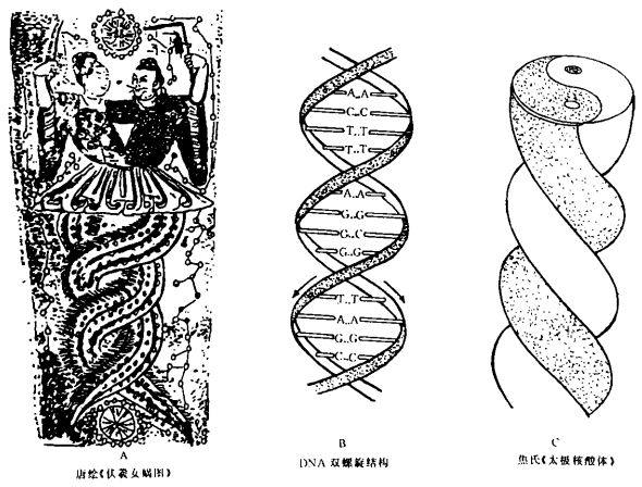 笔者采用唐绘《伏羲女娲图》作为代表周易文化生长过程中所建立的实用价值;再根据现代遗传科学中DNA双螺旋结构的发现,证实了周易哲学文化的科学内涵。合并这两种关系的逻辑发展,笔者就将太极图与DNA相互结合,建立了焦氏太极与DNA的立体结构图,如图2C,并名之曰:“太极核酸体”。
