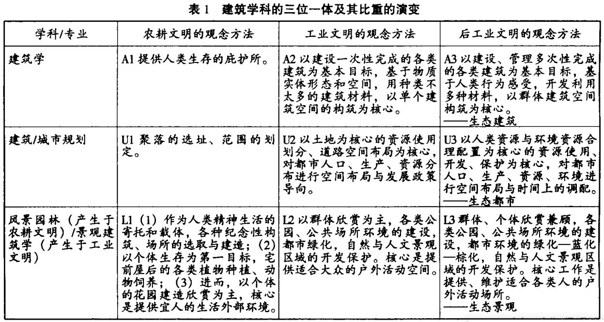 从学科专业角度而论,建筑学、城市规划、景观建筑学经过近代百年的飞速扩展深化,已发展成各有侧重、分工明确的三位一体。与建筑学、城市规划相比,景观建筑学的目标也是创造人类聚居环境,三个专业的核心都是将人与环境的关注处理落实在具有空间分布和时间变化的规划设计上。所不同的是专业分工:建筑学侧重于聚居空间的塑造,专业分工重在空间实体;城市规划侧重于聚居场所(社区)的建设,专业分工重在以用地、道路交通为主的人为场所规划;景观建筑学侧重聚居领域的开发整治:在大范围,是土地、水、大气、动植物等景观资源与环境的综合利用与再创造;在中、小范围,是都市开放空间的规划设计。对此,我们不妨简要地回顾一下三者各自的核心侧重及其演变(表1)。