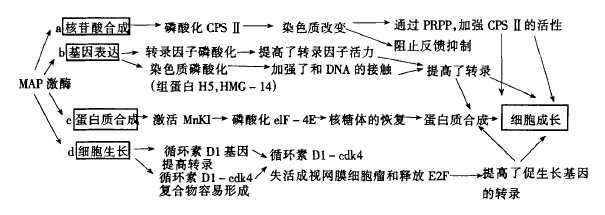 从上述研究结果不难看出,ERK、MAP激酶在细胞生长中起到多种作用。但是,格雷夫斯等人的研究结果,最早证明ERK、MAP激酶直接调控DNA和RNA的合成。在肿瘤细胞中,发现了ERK、MAP激酶的实际活动,通过加强CPSⅡ的活动和增加嘧啶核苷酸的供给,负有促癌形成的责任。的确,在多种类型的癌细胞内,CPSⅡ的活力都是增高的,这大概是赋予了它们一种关于生长和DNA复制的选择优势。
