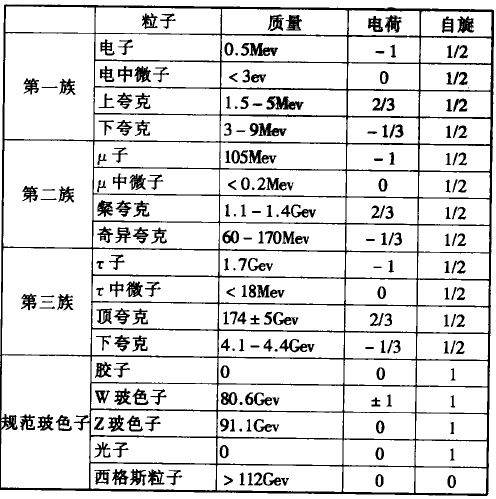表1.标准模型中的粒子和它们的性质。由于这些粒子的发现,许多物理学家获得了诺贝尔奖。因为不能观察到单个夸克,只能得到它们质量的近似值。