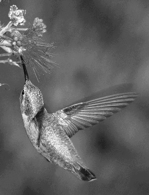 在群芳吐蕊的花丛中,一只小鸟翩翩而来,在一朵红花上戛然而止,它不是落在枝杈上,而是像直升机似地悬停在空中,利用修长的喙,小心翼翼地采食花蜜,然后又了无痕迹地悄然而去。这里,似乎什么也没有发生过,鲜花依旧怒放,就连叶儿上的露珠也未曾因鸟儿的造访而抖落。这就是蜂鸟(hummingbird),一种西半球特有的鸟类。