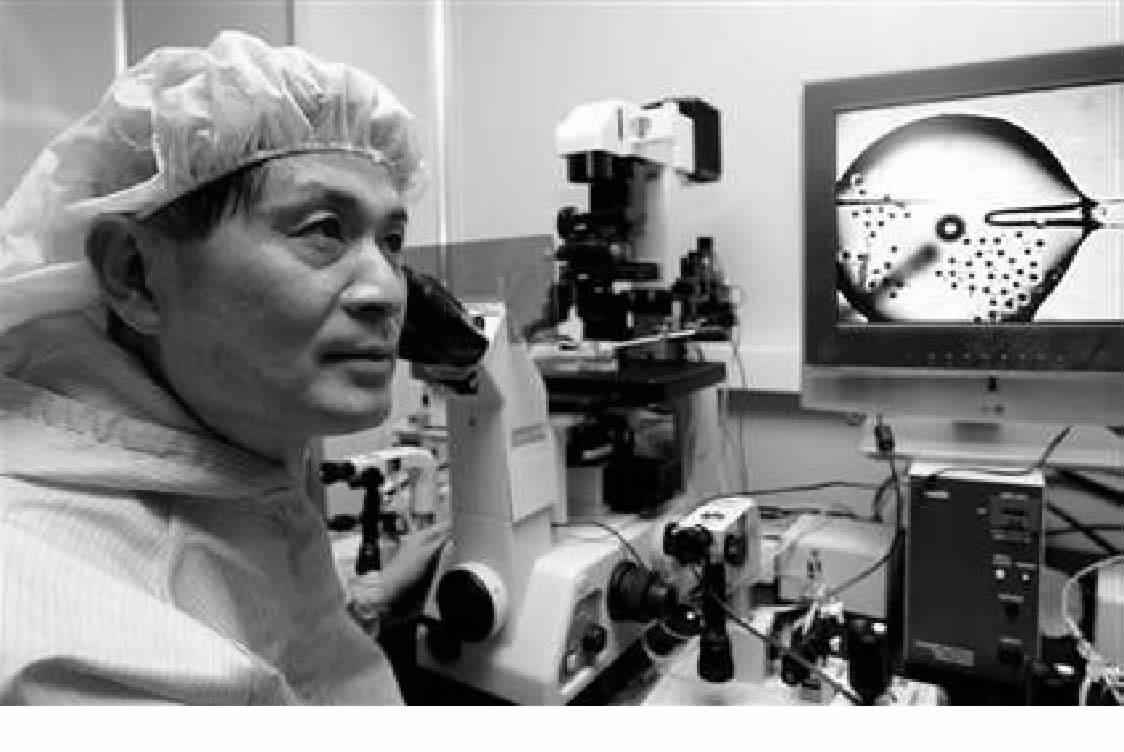 韩国首尔:5月30日——事先已经用一根微型针(microneedle)从一枚新鲜的人类卵子中挤出了全部遗传物质。星期一上午,在近乎黑暗的实验室里(黑暗是为了保证干细胞能正常生长——译者注),一名身穿蓝色连体衣的技术人员仔细探查着这枚卵子的外膜并在膜上轻轻刺着,试图把免疫缺乏病人的一个皮肤细胞的细胞核注入卵子。