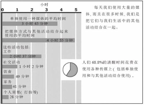 一项最新的研究表明:人们在清醒的时候几乎总是专注于某一形式的传媒。在一项经历了5000小时跟踪调查中,研究人员监测了394名西方中年人对传媒的使用编好,受试者手腕佩戴的仪器每隔15秒就记录下他们使用传媒的情况。通过每天12小时的跟踪,结果显示,有30%的人在清醒的时候把时间花在单一的传媒方式上,39%的人在使用一种传媒方式的同时也在进行另一项活动。比如在准备食物的时候看电视,在工作的时候听广播。总的来说,有超过2/3的人在清醒的时候使用了某一形式的传媒方式。