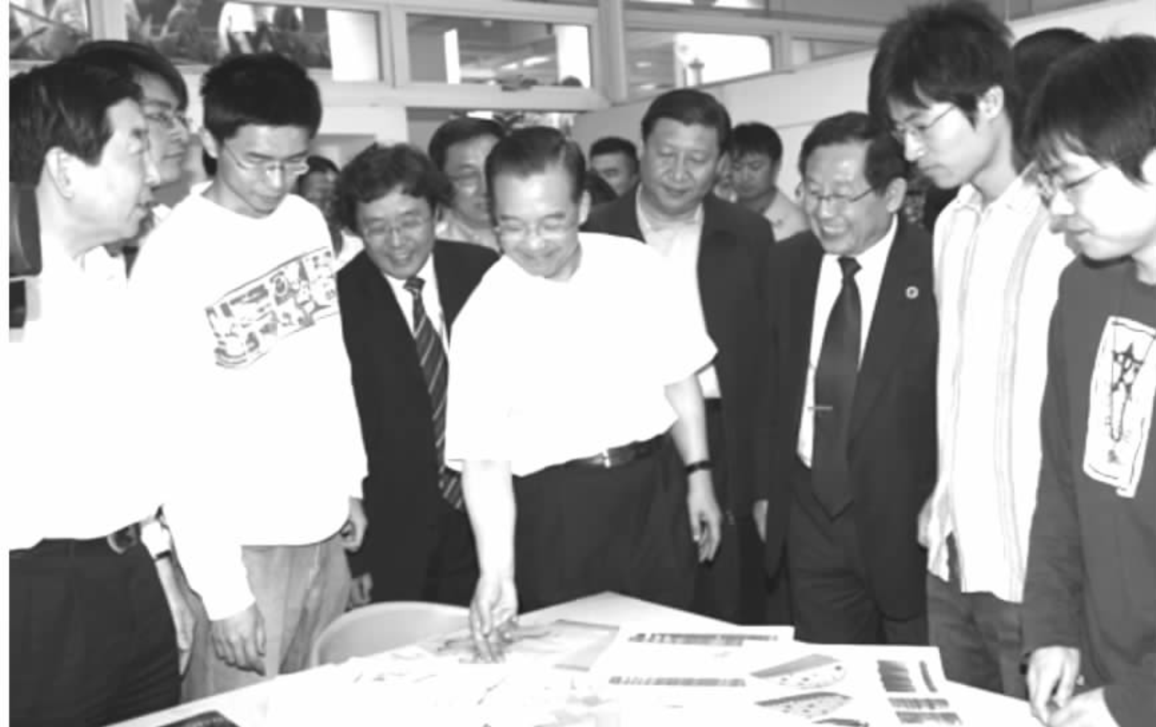 温家宝总理在同济大学明城楼驻足观看同学们设计的“世博会中国馆”主题作业