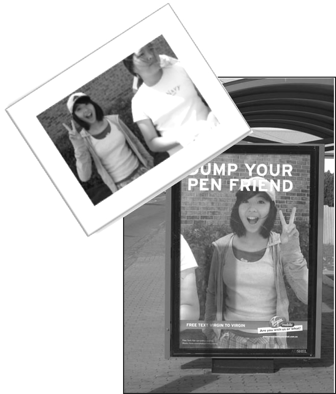 例证:一个15岁的美国女孩艾莉森·陈(Alison Chang)发现她上传到Flickr的一张在汽车清洗站拍的照片被澳大利亚的维珍移动(Virgin Mobile)用在了一次广告活动中;而且她不喜欢自己在广告中的形象———被描绘成一个酷爱使用维珍公司文字信息服务倾诉的傻乎乎的笔友。直到朋友将广告的拷贝发给她时,她才发现自己的照片被“盗用”了。