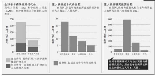 由阿尔茨海默氏症研究信托基金会委托编制的“2010年阿尔茨海默氏症报告”估计,2010年英国因阿尔茨海默氏症付出的成本代价为230亿英镑(380亿美元),差不多是癌症付出代价(120亿英镑)的两倍,远远超过心脏(80亿英镑)和中风(50亿英镑)的成本代价(见图2(2):“重大疾病成本代价比较”)。