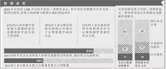 然而,科学家本人做数据管理时也可以有一些新的选择,如DataONE,一个由米切纳领导、NSF资助的国际数据保护和共享网站;另一个是Dryad,可以帮助研究人员识别数据集,并将之存储和链接出版物。目前,很多公司都开展了这方面的数据服务业务,包括伦敦figshare(隶属于《自然》前身麦克米伦出版社)和去年由汤姆森路透集团在纽约发起的数据引文索引。