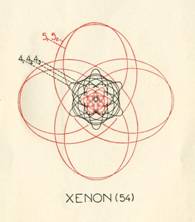 图4.详细的原子插图,如这个关于氙原子(Z = 54)的结构图,是尼尔斯·玻尔在1921年至1923年间讲座的一个内容。根据玻尔理论,在原子外部(主量子数n > 3),每个轨道41, 42,和43含有六个电子,最外层轨道51和52每个轨道有四个电子。奇主量子数的轨道是红色的,偶量子数的轨道是黑色的。一些简单的椭圆轨道没有在图上显示,但他们实际上随着椭圆慢慢的旋进呈现微开的样子。虽然本图显示的是二维空间结构,但实际情况下原子的电子是在三维空间运动的。
