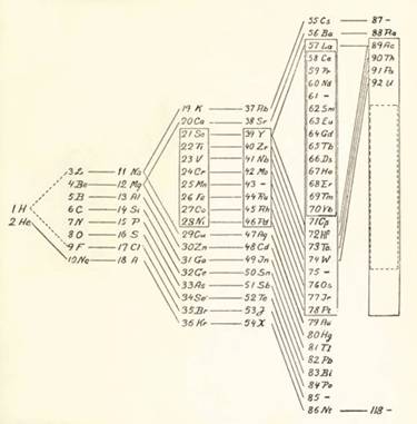 图5.是1923年尼尔斯·玻尔关于元素周期表的设想。71号元素(Cp、镥)即今日的镥(Lu),86号元素 (Nt,氡)即氡。缺失的75号元素(Re,铼)在1925年通过x射线光谱分析被发现,运用同样方法,也发现了1923年初提出的铪的存在。