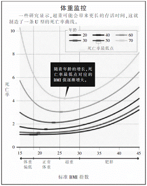 在接下来的几年里,其他的研究者也发现了相同的趋势,于是弗莱戈决定完成那项综合性分析研究。“我们觉得现在应该是把所有东西整合到一起的时候了,”她说,“我们可能还没理解所有这些意味着什么,但我们至少要把这些信息全部呈现出来。”她的分析包括了97个用BMI评估了所有死亡率影响因素的预期研究。所有的研究都使用了标准的数据来调整吸烟、年龄和性别的影响。当来自所有年龄层的成年人的数据结合的时候,BMI在超重范围(25~29.9)的人们显示出了最低的死亡率。