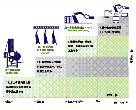 这意味着,人类有史以来第一次可以将资源、信息、实体和人互联,形成物联网和服务互联网。这一现象的影响也将延伸到工业领域,在制造业领域,这种技术演进可以称为工业化的第四阶段,或工业4.0(见图)。