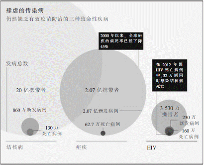 研究人员对根除疟疾充满了信心,因为正在研发的疟疾疫苗可针对寄生虫复杂生命周期的每个阶段。最新的遗传分析方法最终将消除人们对结核的恐惧,也许还可以减少临床试验的成本。此外,基础研究已经证实了艾滋病病毒存在一定的薄弱点,研发出的一种治疗猴艾滋病的疫苗,正在进行临床试验。