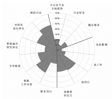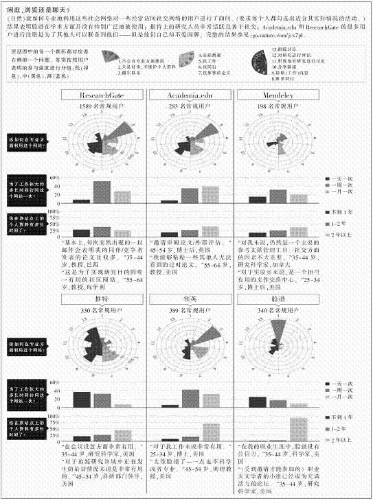 为了对互动的品质做一个粗略的估计,《自然》就在他们经常访问的站点中实际上在做什么这个问题对该调查中最活跃的一部分用户进行了询问(见“闲逛、浏览还是聊天?”)。ResearchGate和Academia.edu的用户选择最多的一项活动是完善并维护个人的资料,以便有人想和他们取得联系――这表明很多研究人员把他们的个人资料作为提升自己在网络上职业风采的一种方式(见“个人资料的战斗”)。此外,最常见的选择还包括上传与自己工作相关的内容、发现相关的论文、跟踪指标以及搜索他人推荐的研究论文。丹尼·奥克莱尔(DeniAuclair)是位于加州伯林盖姆的Outsell这个媒体、信息和技术咨询公司的首席分析师,他认为,“这些站点都是人们用来提高自己的声望并让自己更容易被别人发现的工具,而不是社会交往的社群工具”。相比之下,虽然《自然》的调查结果显示,只有13%的科学家会经常使用推特,但是它却更具有互动性:过半数的推特用户说他们用推特来跟踪与研究相关的议题的讨论,还有40%的用户说推特是一个“对我的研究领域相关的研究进行评论”的媒介(ResearchGate在这方面的数据只有15%)。