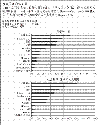 同ResearchGate相比,Academia.edu看起来并不那么出名:在我们调查的科学家中,只有29%的人知道它,并且只有5%的人经常访问该站点。但是它也有自己的粉丝,位于德国盖斯特哈赫特的沿海研究学会的主任同时也是气候科学家的汉斯·范·斯托奇(Hans von Storch)就是该站点的粉丝之一,他不仅利用这个站点来分享他的科研论文,而且还会分享他的观点、书评和演讲。普莱斯指出总体上来说Academia.edu要比ResearchGate更容易出现网站拥堵,可能是因为任何人都可以加入该网络,这和它的对手是不一样的。对于《自然》调查中包含的这480名社会学、艺术和人文学者来说,这两个站点的使用的匹配度也很高。