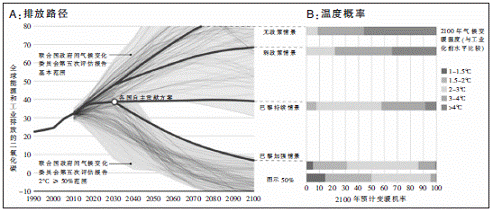 (B)中所图示的50%的情景,对应如下的排放轨迹,即到2100年,有50%机率把气候温度变化控制在2°C以下。另外的50%排放轨迹可能导致的温度分布范围,取决于二氧化碳排放和其他温室气体的累积