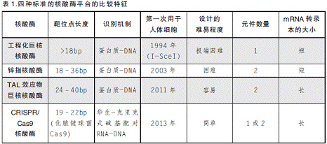 工程化核酸酶平台有六种,四种是基本的、两种是杂交的,它们是:工程化巨核核酸酶、ZFNs、TALENs、CRISPR/Cas9核酸酶、巨大TAL核酸酶和Cas9-FokI核酸酶(表1)。这些核酸酶平台之间都有细微的差异,例如,构建起来的折断类型是不同的:大范围核酸酶和巨大TALs生成的是3′突出端的折断;ZFNs构建的是5′突出端的折断;TALENs构建的折断在位置上是可变的,通常是(但不总是)5′突出端,由FokI核酸酶(Fn)的性能决定;而CRISPR/Cas9核酸酶构建的是钝的折断。但总的来说,这些平台中每一个都可以介导它们的编辑效用,是通过一种DSB的构建实现的,因此它们共享了一种基础性的作用机制。