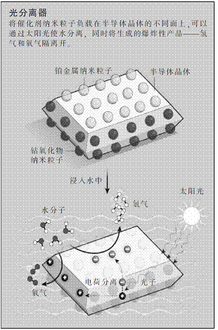 在中国科学院大连催化基础国家重点实验室,中科院院士李灿使用铂和钴的氧化物纳米粒子合成了利用太阳光分离水的催化剂(详见水分离工艺过程示意图)。他首先将纳米粒子负载在铋钒氧化物半导体的晶体上,每种类型的粒子小心地固定在每种晶体的特定面上。然后,他将晶体浸没在水中,接受太阳光的照射,光子撞击半导体,失去电子。结果就是纳米粒子用于分解水成为氧气和氢气而形成的电流。氧气流从钴氧化物所在的位置汩汩冒出,而负载正电的氢气离子则迁移至铂粒子所在的位置。“我们将活性位置分开,以阻止反方向反应发生。”李院士说,这种反方向的反应就是氢气和氧气合成水,这是一种非常危险的爆炸性反应,谁都不希望它发生。为了简化实验配置,目前使用另外一种化合物来捕获氢离子,而不是让它直接转化成氢气流。这个工艺过程目前效率还不够高,经济上还不可行。李院士和他的团队正在测试不同半导体和金属催化剂的组合,以提升反应效率。