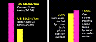 左:2016年传统出租车的价位是每公里0.93美元;到2030年自动驾驶出租车的价位将是每公里0.31美元;右:像欧洲里斯本这样的中型城市,通过自动驾驶车辆的拼车策略能够把街道清空:自动驾驶出租车外加地铁系统会将90%的汽车淘汰,会将100%的街道停车位空出来